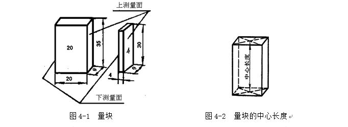 長(zhǎng)度量塊是用耐磨性好,硬度高而不易變形的軸承鋼制成矩形截面的長(zhǎng)方塊,如圖4-1所示。它有上、下兩個(gè)測(cè)量面和四個(gè)非測(cè)量面。兩個(gè)測(cè)量面是經(jīng)過(guò)精密研磨和拋光加工的很平、很光的平行平面。量塊的矩形截面尺寸是:基本尺寸0.5~10mm的量塊,其截面尺寸為30mm×9mm;基本尺寸大于10至1000mm,其截面尺寸為35mm×9mm。