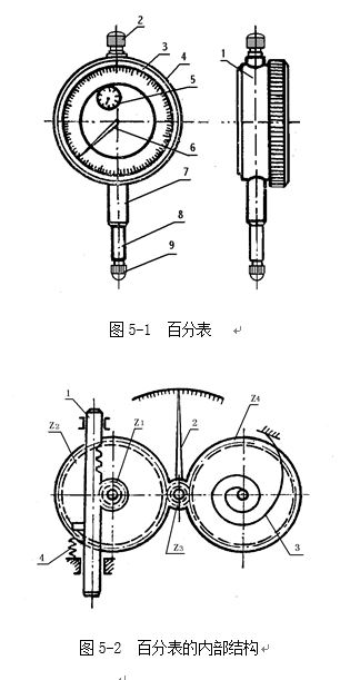 圖5-2是百分表內(nèi)部機(jī)構(gòu)的示意圖。帶有齒條的測(cè)量桿1的直線移動(dòng),通過齒輪傳動(dòng)(Z1 、Z2 、 Z3),轉(zhuǎn)變?yōu)橹羔?的回轉(zhuǎn)運(yùn)動(dòng)。齒輪Z4和彈簧3使齒輪傳動(dòng)的間隙始終在一個(gè)方向,起著穩(wěn)定指針位置的作用。彈簧4是控制百分表的測(cè)量壓力的。百分表內(nèi)的齒輪傳動(dòng)機(jī)構(gòu),使測(cè)量桿直線移動(dòng)1mm時(shí),指針正好回轉(zhuǎn)一圈。