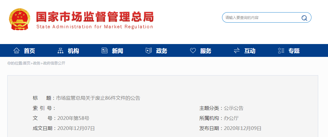 市場監(jiān)管總局關(guān)于廢止86件文件的公告
