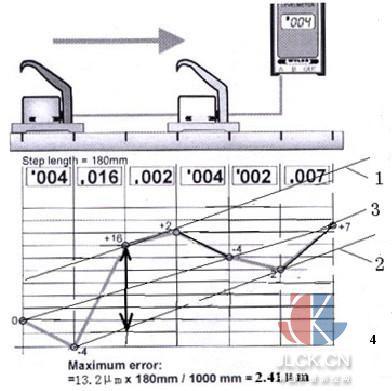 利用數(shù)顯式電子水平儀逐檔測(cè)量導(dǎo)軌的直線度,步距l(xiāng)有150mm, 180mm,200mm等。第一檔0-l,第二檔l-2l;并逐檔將讀數(shù)記錄下來。但取數(shù)后,進(jìn)行計(jì)算或作坐標(biāo)圖時(shí),各類專業(yè)書上所采用的方法差別較大,常用的為作圖法和計(jì)算法。