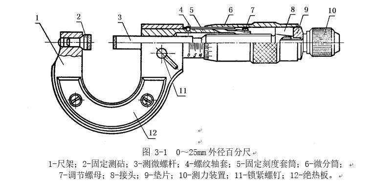 各種百分尺的結(jié)構(gòu)大同小異,常用外徑百分尺是用以測量或檢驗零件的外徑、凸肩厚度以及板厚或壁厚等 (測量孔壁厚度的百分尺,其量面呈球弧形 )。百分尺由尺架、測微頭、測力裝置和制動器等組成。圖3―1是測量范圍為 0~25mm的外徑百分尺。 尺架1的一端裝著固定測砧2,另一端裝著測微頭。固定測砧和測微螺桿的測量面上都鑲有硬質(zhì)合金,以提高測量面的使用壽命。尺架的兩側(cè)面覆蓋著絕熱板12, 使用百分尺時,手拿在絕熱板上,防止人體的熱量影響百分尺的測量精度。