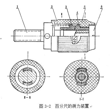 百分尺測力裝置的結(jié)構(gòu)見圖3-2,主要依靠一對棘輪3和4的作用。棘輪4與轉(zhuǎn)帽5連結(jié)成一體,而棘輪3可壓縮彈簧2在輪軸1的軸線方向移動,但不能轉(zhuǎn)動。彈簧2的彈力是控制測量壓力的,螺釘6使彈簧壓縮到百分尺所規(guī)定的測量壓力。當(dāng)我們手握轉(zhuǎn)帽5順時針旋轉(zhuǎn)測力裝置時,若測量壓力小于彈簧2的彈力,轉(zhuǎn)帽的運動就通過棘輪傳給輪軸1(帶動測微螺桿旋轉(zhuǎn)),使百分尺兩測量面之間的距離繼續(xù)縮短,即繼續(xù)卡緊零件;當(dāng)測量壓力達到或略微超過彈簧的彈力時,棘輪3與4在其嚙合斜面的作用下,壓縮彈簧2,使棘輪4沿著棘輪3的嚙合斜面滑動,轉(zhuǎn)帽的轉(zhuǎn)動就不能帶動測微螺桿旋轉(zhuǎn),同時發(fā)出嘎嘎的棘輪跳動聲,表示巳達到了額定測量壓力,從而達到控制測量壓力的目的。當(dāng)轉(zhuǎn)帽逆時針旋轉(zhuǎn)時,棘輪4是用垂直面帶動棘輪3,不會產(chǎn)生壓縮彈簧的壓力,始終能帶動測微螺桿退出被測零件。